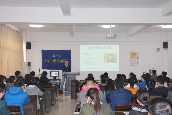 报告前,王小明院长发表了热情洋溢的致辞,并一同观看了CCF宣传片。随后,谭晓生先生以幽默的方式做了开场白,并介绍了CCF的有关情况及其近几年来的发展。接着,谭晓生先生从信息安全方面的专业知识开始,介绍近几年国际国内的热点网络安全事件,及网络空间安全技术的发展,通过安全防御实例说明网络安全及相关技术的重要性。谭晓生先生还通过个人的发展,用自己的亲身经历告诉同学们在大学应该修炼的能力及如何规划自己的未来生活。分享职业发展相关的内容及安全网络岗位的相关信息。他指出,在竞争压力很大的现代社会,必须有良好的心智,要有所追求,从一点一滴锻炼自己,充实自己。